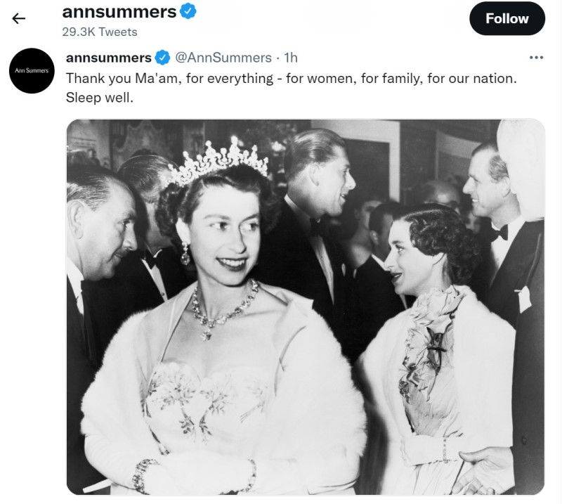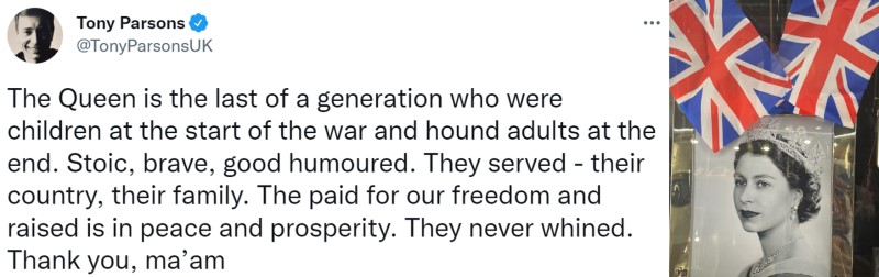 Elizabeth II: ‘The original girl boss’ Posted on 16 September 2022 by Lion & Unicorn Leave a comment As the nation’s official Blog of Record, we present a selection of tweets reflecting the response to the death of Queen Elizabeth II on 8 September 2022. Discover more from Lion & Unicorn Subscribe to get the latest posts sent to your email. Type your email… Subscribe Share this: Click to share on X (Opens in new window) X Click to share on Facebook (Opens in new window) Facebook Click to email a link to a friend (Opens in new window) Email Click to share on Pinterest (Opens in new window) Pinterest Click to share on Reddit (Opens in new window) Reddit Click to share on Tumblr (Opens in new window) Tumblr Click to share on Bluesky (Opens in new window) Bluesky Like Loading...