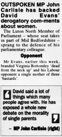 As the 1997 election approached, came an own goal by Evans worthy even of that of his former Luton striker Mick Harford. With voting less than two months away, and Welwyn and Hatfield vulnerable to the likely Labour swing, Evans set his stall out in an interview at Stanborough School in his constituency, which a pupil just happened to tape. He called for the castration of rapists (not hesitating to mention the race of a recent such offender), he questioned the innocence of the Birmingham Six, and he dismissed his Labour rival Melanie Johnson’s chances since she was ‘a single girl, lives with her boyfriend, three bastard children, lives in Cambridge’.