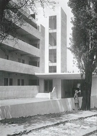 Their project exemplified a new ideal: small utilitarian units with up-to-date modern appliances (built in fridges, cookers etc), free of Edwardian clutter. In their machine for living, unburdened from excess possessions, the renting tenants could concentrate on the important business of life itself. The majority of the apartments were ‘minimum flats’ where a single living space was separated from kitchen and bathroom by a space-age sliding door. There were a few larger apartments, with the Pritchards (who had bought the land) taking the penthouse with roof terrace when the project was completed. Though built and intended as serviced flats for busy professionals (with cleaning, laundering, cooked meals and even shoe-polishing provided by staff in residence), the Lawn Road Flats’ design anticipated a reinforced concrete future of social housing for the workers under post-Second World War socialism.